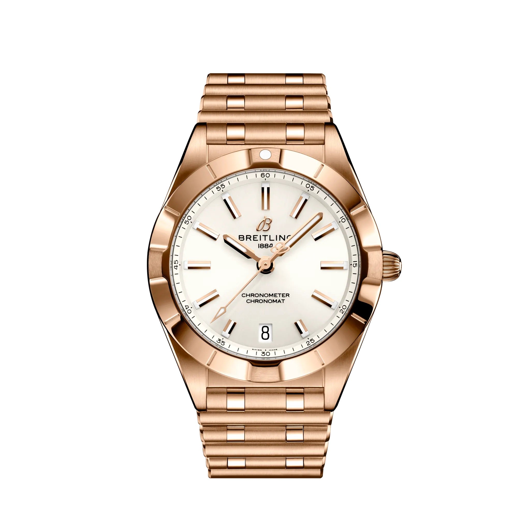 Breitling Chronomat. White dial 32 mm 18k Red Gold case. Cambered sapphire, glareproofed both sides crystal. Breitling 77 calibre, SuperQuartz™, thermocompensated quartz electronic, EOL indicator, 3 to 4 years power reserve. 18k Red Gold bracelet. Water resistance 100 m (330 ft).