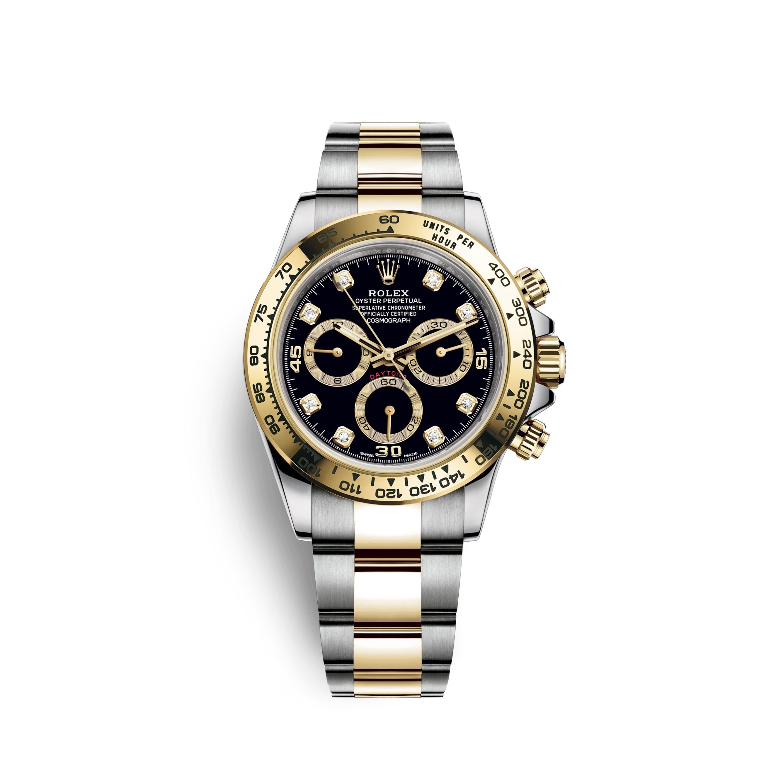Rolex Cosmograph Daytona, 18k Yellow Gold and Stainless Steel 40mm watch. This model has Black dial with Black sub-dials with fine yellow gold rims. Hour markers are 10 Diamonds in 18k gold settings and polished 18k Yellow Gold hands – hour and minute hands with black centerline and partial luminous fill. Fine printed minute/seconds and fractions of a second track on teh dial perimeter. Polished 18kt Yellow Gold screw-down crown with Rolex’s patented “Triplock” triple waterproofness system, ensuring that the crown screws down against the Oyster case as securely as a submarine hatch. Screw-down chrono buttons in polished 18kt yellow gold. The dial closed by a Scratch-resistant Sapphire Crystal and solid case back made. Chronograph/Stop watch function: large central seconds counter hand – accurate up to 1/8th of a second; 30-minute counter sub-dial located at the 3 o’clock position; 12-hour counter sub-dial located at the 9 o’clock position. Continuous running small seconds hand sub-dial located at the 6 o’clock position. The watch is equipped polished 18kt Yellow Gold fixed bezel ring with engraved and black filled Tachymeter scale. The watch is mechanical chronograph; self-winding Manufacture Rolex 4130 contains 44 Jewels and has an approximate power reserve of 72 running the time only, or 66 hours with the chronograph function running. This model presented on brushed and polished 18k Yellow Gold and Stainless Steel Oyster bracelet of flat three-piece links with a folding Oysterlock safety clasp with Easylink 5 mm comfort extension link. The water resistance is up to 100m/330ft (10 ATM).