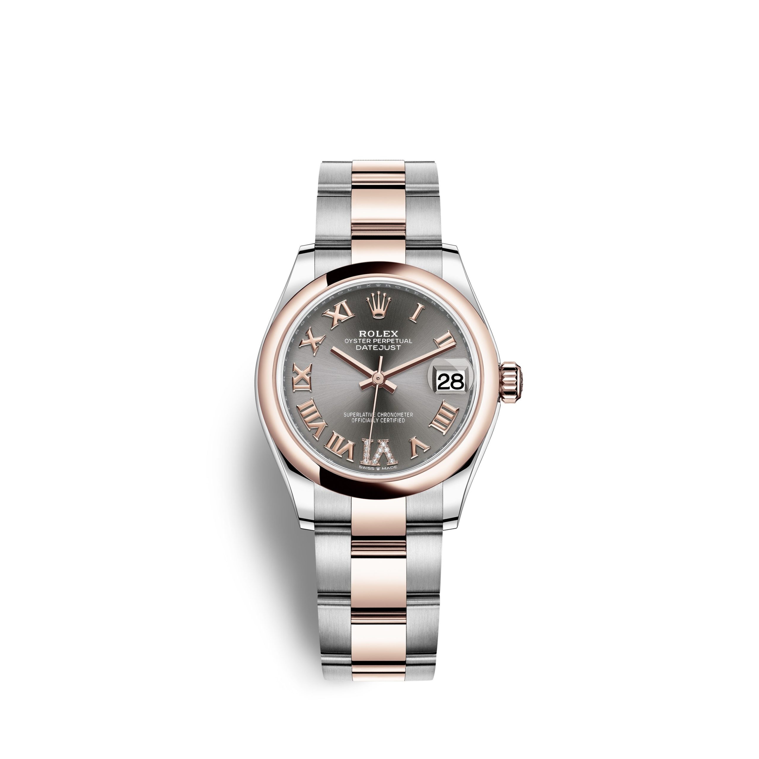 • Dial color: Slate dial with a fine sunray and 11 diamonds on large numeral VI, and Roman Numerals as hour markers of 18k Everose Gold