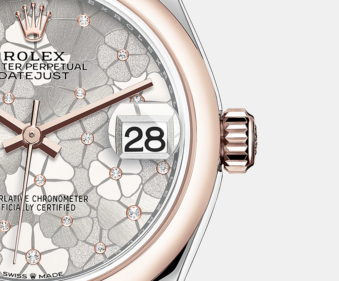 - Dial color: Silver dial with floral motif and 24 Diamonds in 18k Everose Gold settings