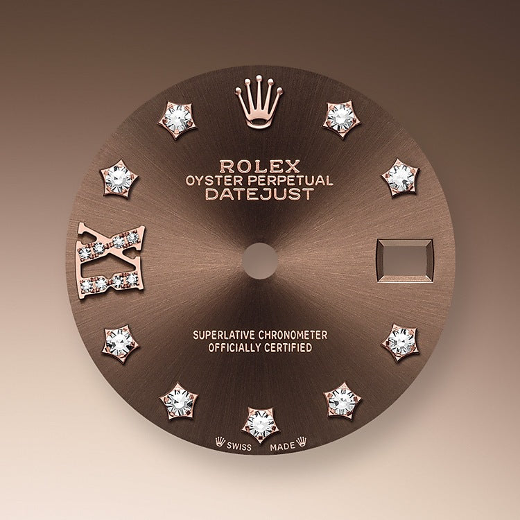 • Dial color: Chocolate dial with a fine sunray and Nine diamonds set in star-shaped framed in 18k Everose Gold  settings and 8 diamonds set in Roman numeral IX framed in 18k Everose Gold